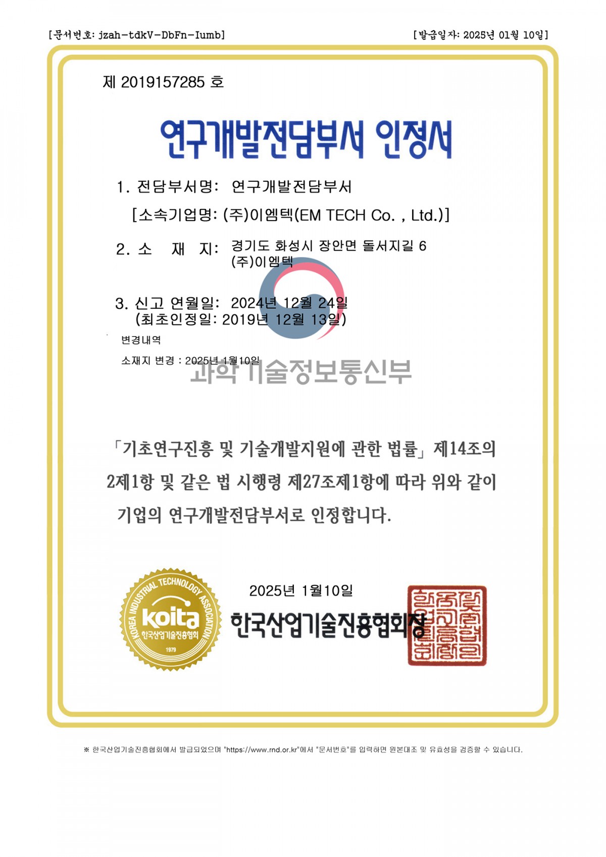 [인증서] 연구전담부서 인정서(돌서지길6)