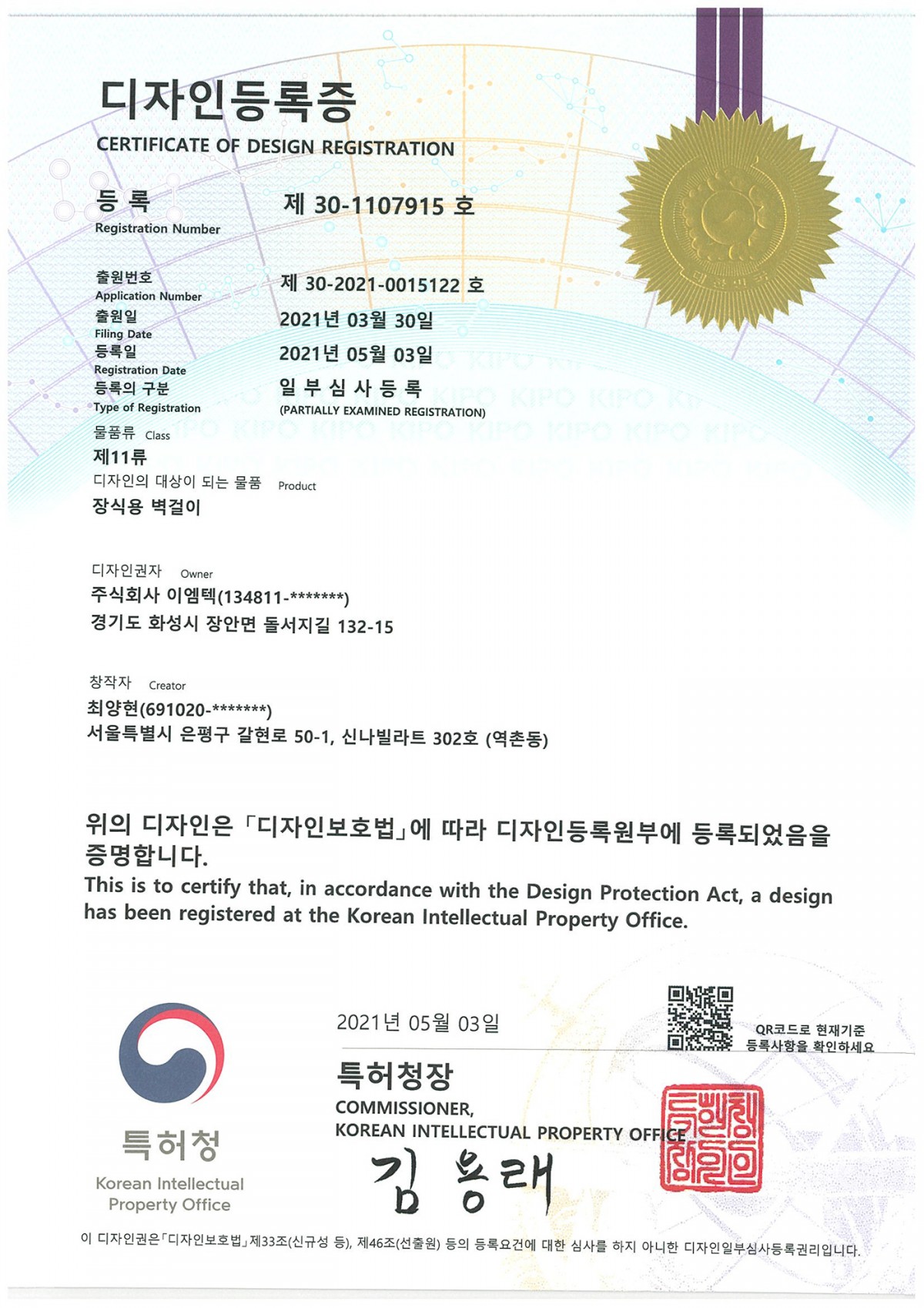 특허 디자인등록증 제 30-1107915호(장식용 벽걸이)