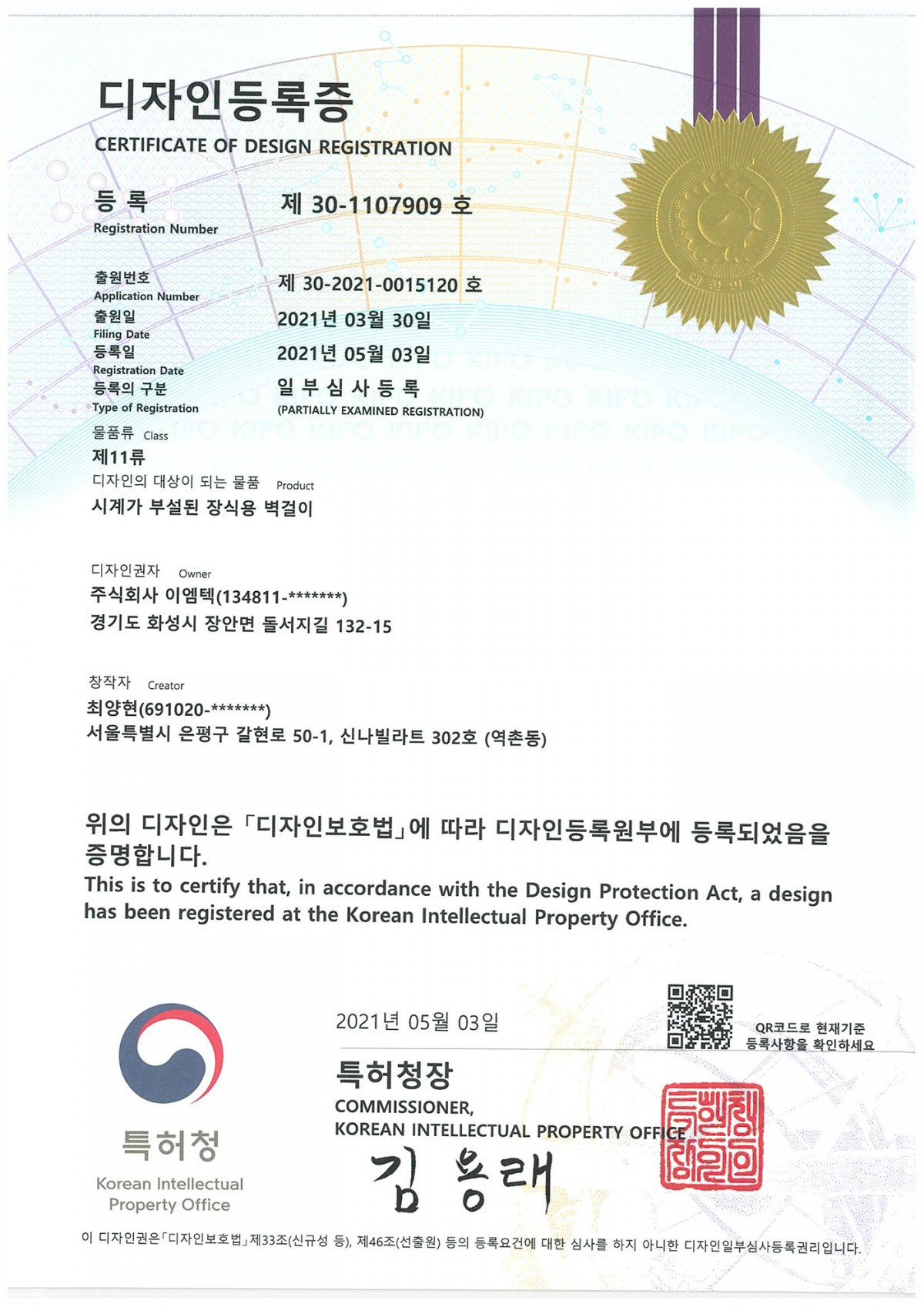특허 디자인등록증 제 30-1107909호(시계가 부설된 장식용 벽걸이)