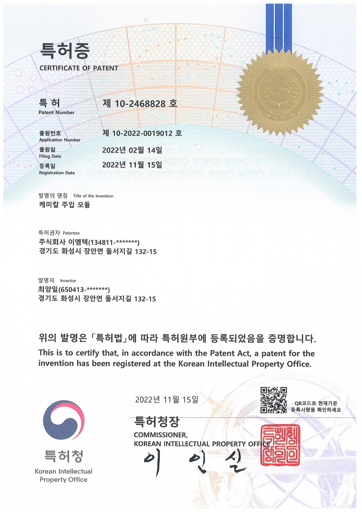 특허 특허 제 10-2468828호 (케미칼 주입 모듈)